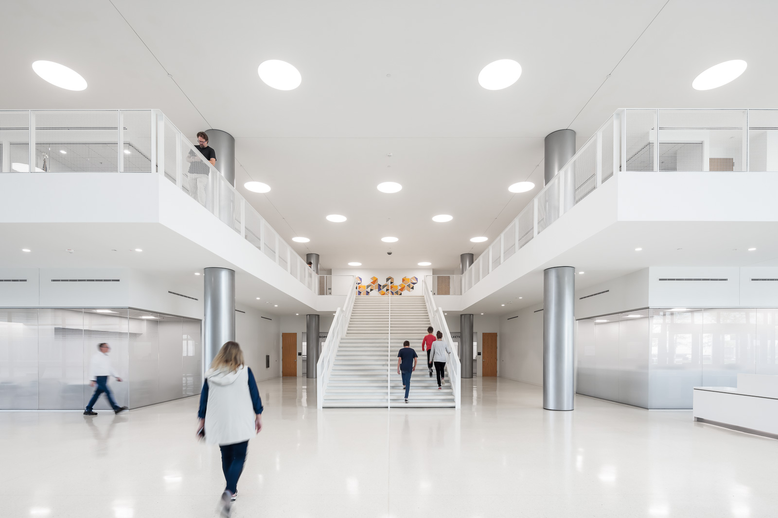 Due to the building’s emphasis on transparency in its design, concerns arose about the potential heat and solar gain resulting from incoming sunlight. Windward Lighting Studio (WLS) conducted various daylighting and sun studies to provide recommendations for suitable shading solutions that would establish an environment harmonizing comfort with visibility. Additionally, WLS was tasked with designing the building’s exterior and courtyard lighting, a challenge given the restriction of not attaching fixtures directly to the building itself. The installation above the courtyard is programmed for custom color patterns, allowing the Administration Buildings to exhibit university- or holiday-specific colors.