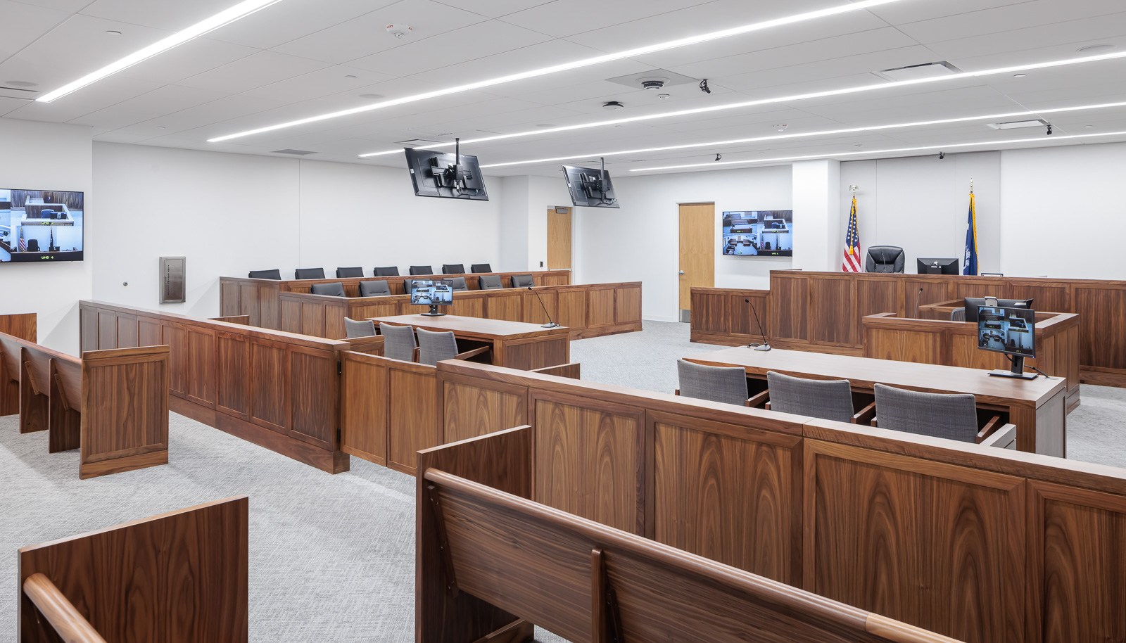 Throughout, the interiors embody a commitment to timeless elegance, durability, and a deep connection to community. The design creates a welcoming energy with a bright, clean aesthetic consisting of a neutral color palette and rich wood. Custom furniture solutions in the courtrooms, which are cohesive with the millwork, are investment pieces, built to last decades. With a focus on creating interior spaces that reflect the area’s growth and vibrant energy, the design team prioritized settings that took advantage of the abundant natural light, furthering the goal of fostering openness and connection. Quality finishes and furnishings underscore a forward-thinking, durable approach that considers the future needs of the County administration.