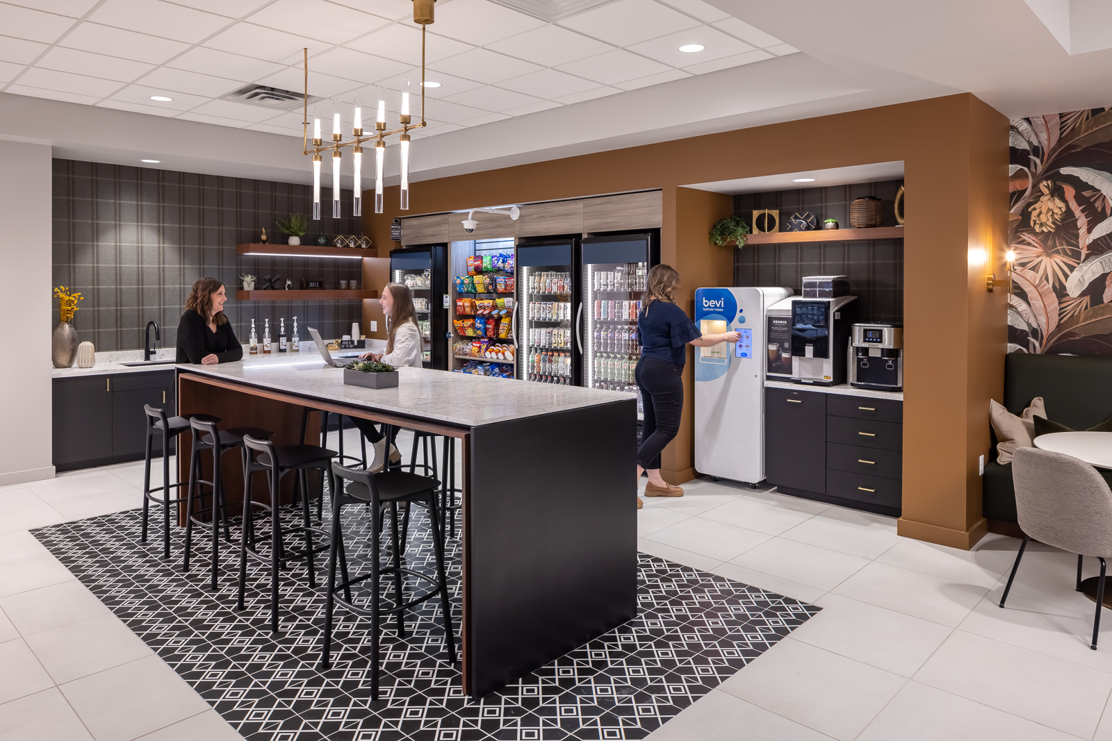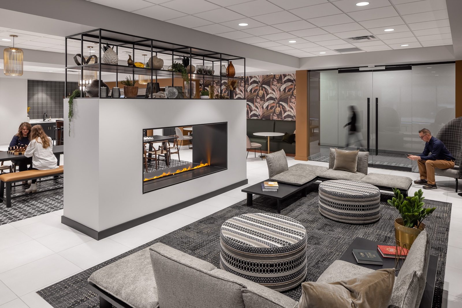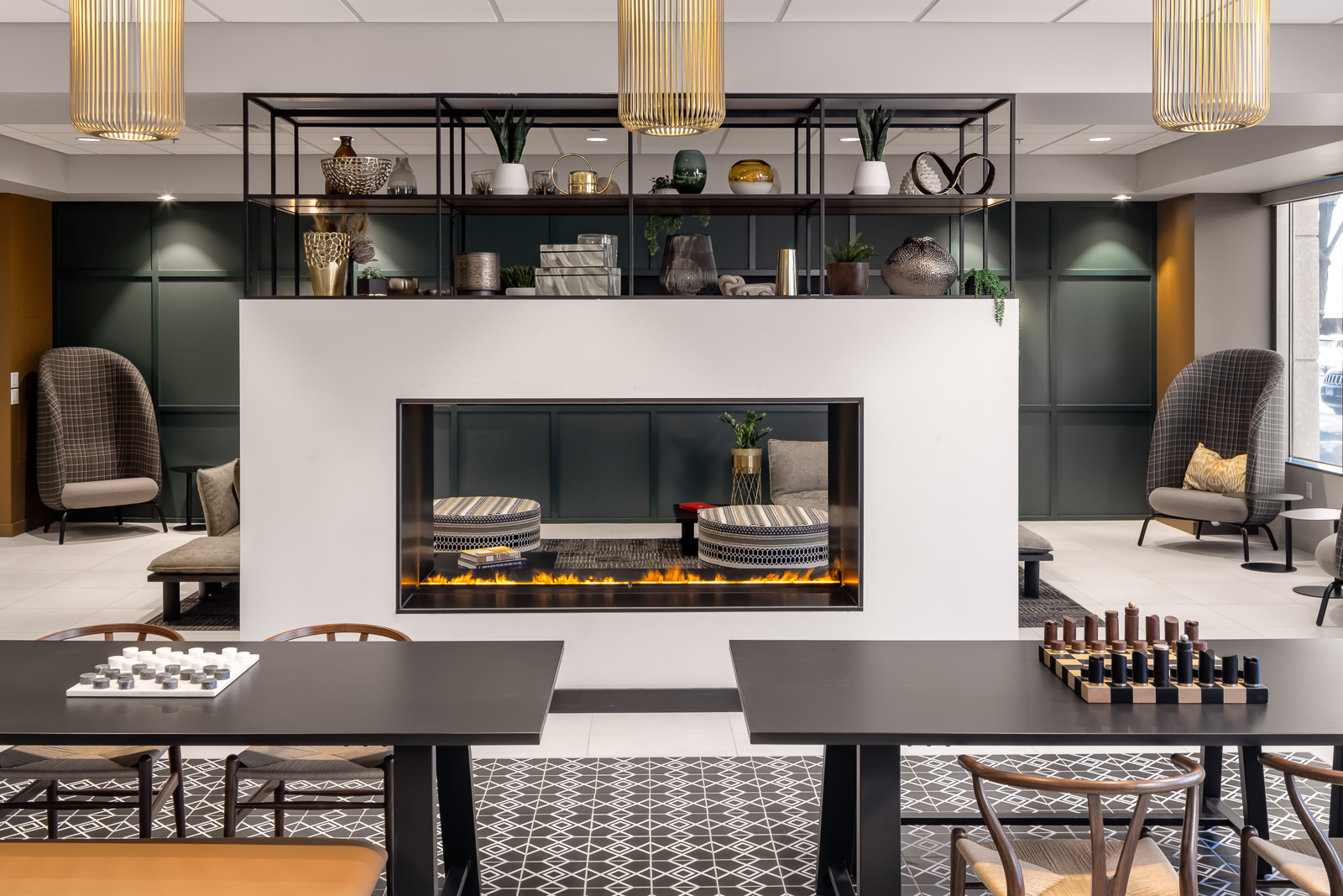 The amenity space, dubbed 701 Local, was built to maximize a small footprint of 1,700 square feet. The centerpiece of the space is the water mist fireplace that was added to elevate comfort and partially separates the lounge from the grab-n-go market. The cozy, inviting space provides multiple options for socialization.