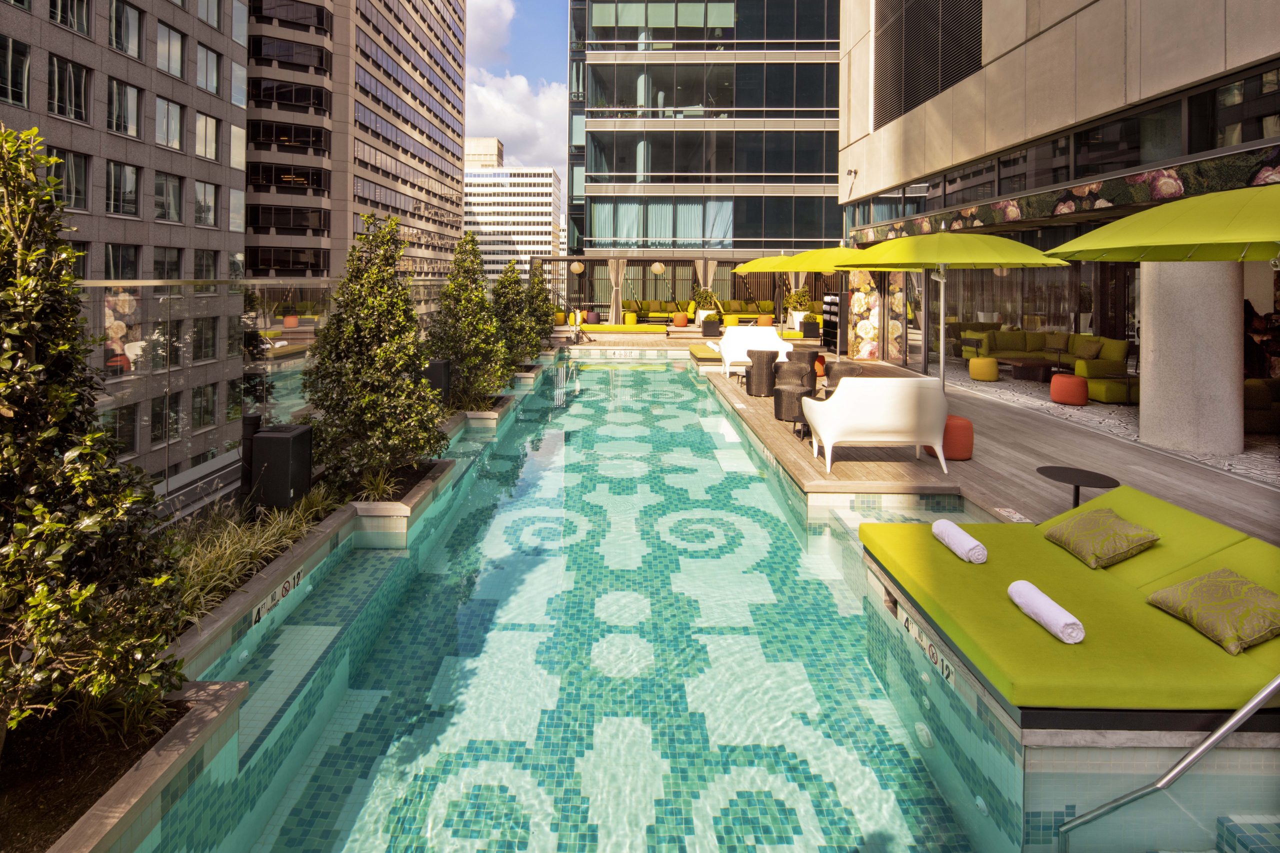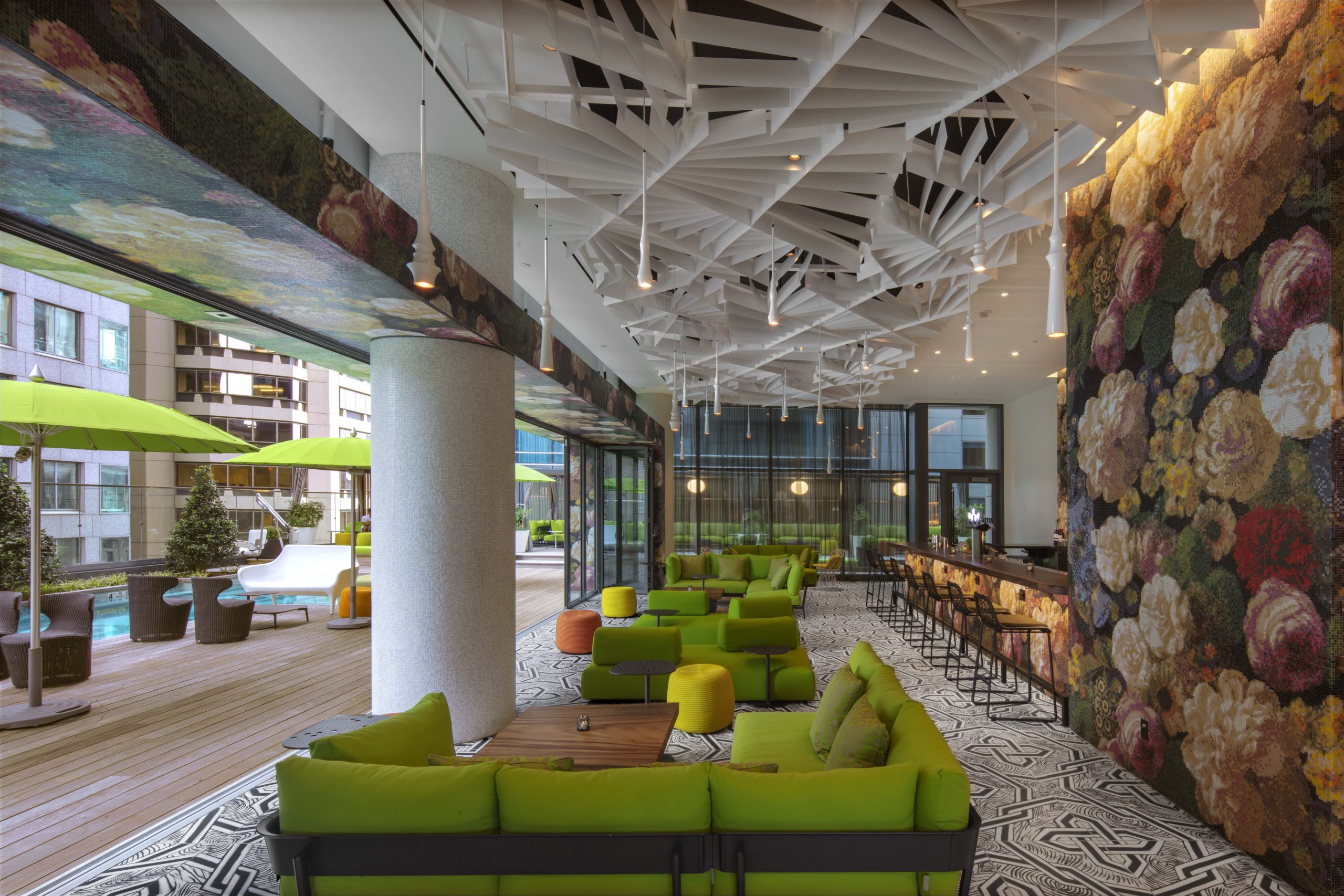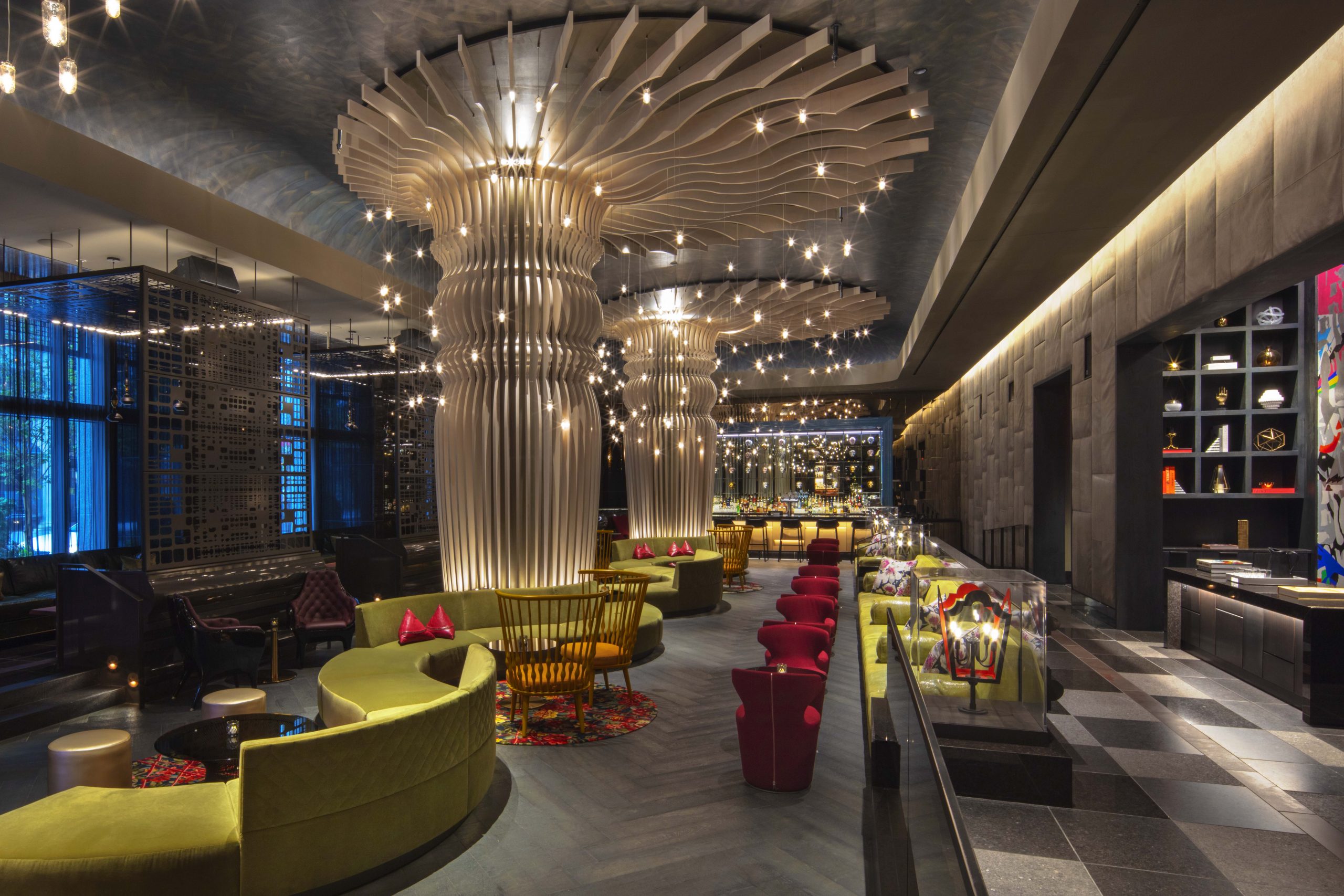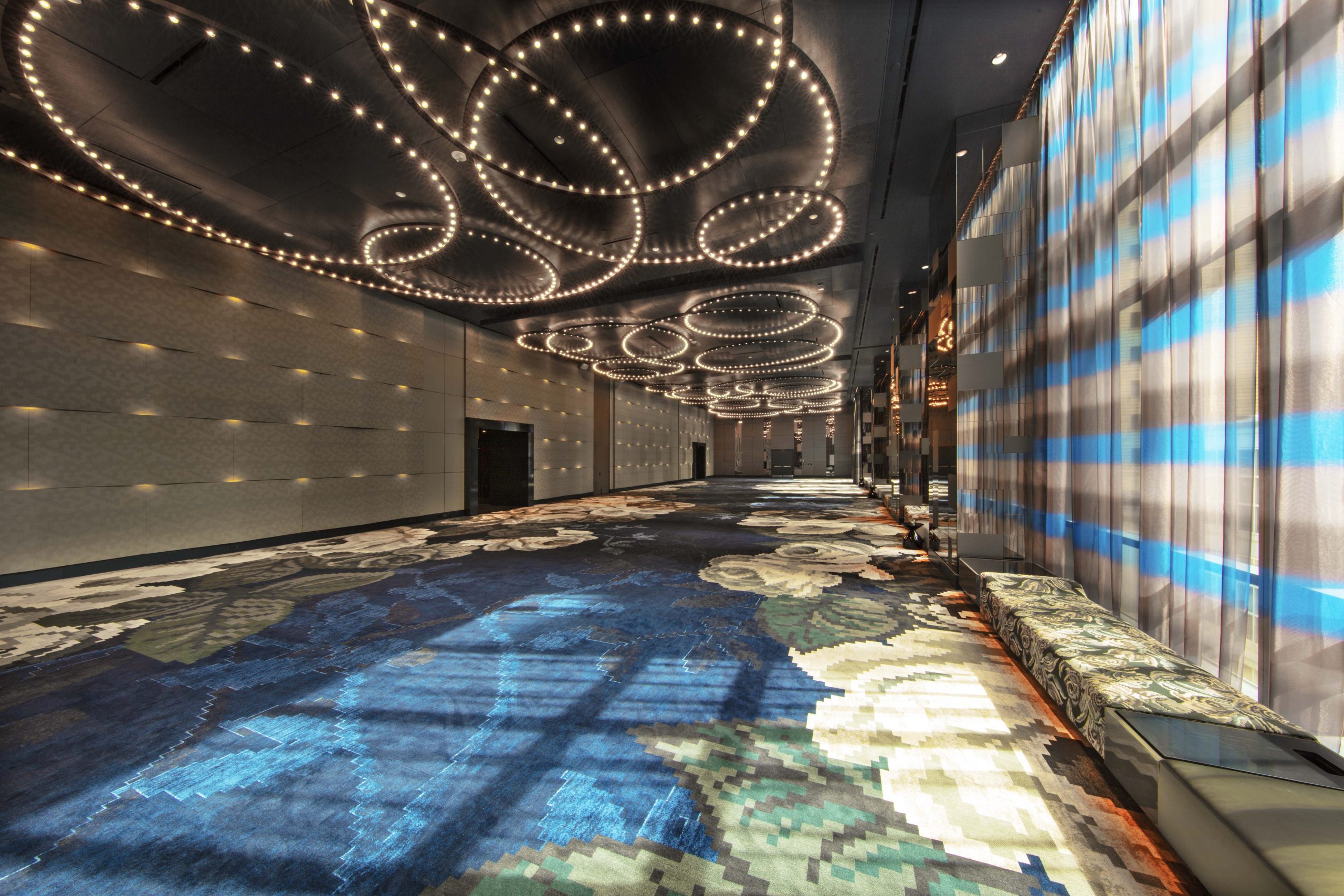 The façade encompasses a mosaic of textures and patterns of stone, metal, and glass, representing the layers of history and culture that are interwoven into Philadelphia’s social fabric. Paying homage to Penn’s planned city, we designed a patterned grid into the W entrance as one of many examples illustrating how the design narrative “Ring Free” created by the interior designer, designstudio ltd, is woven into both the architecture and the interior design.