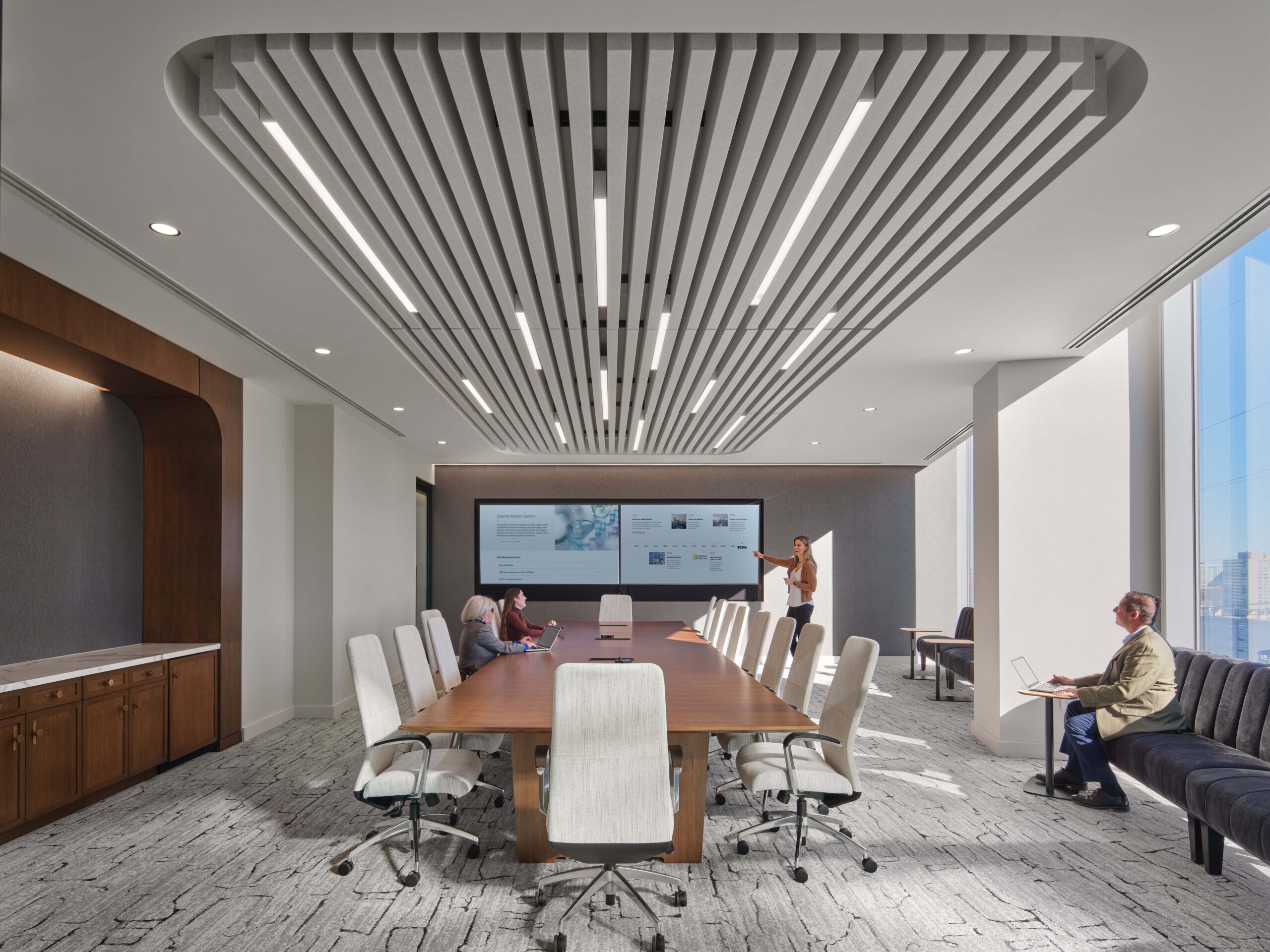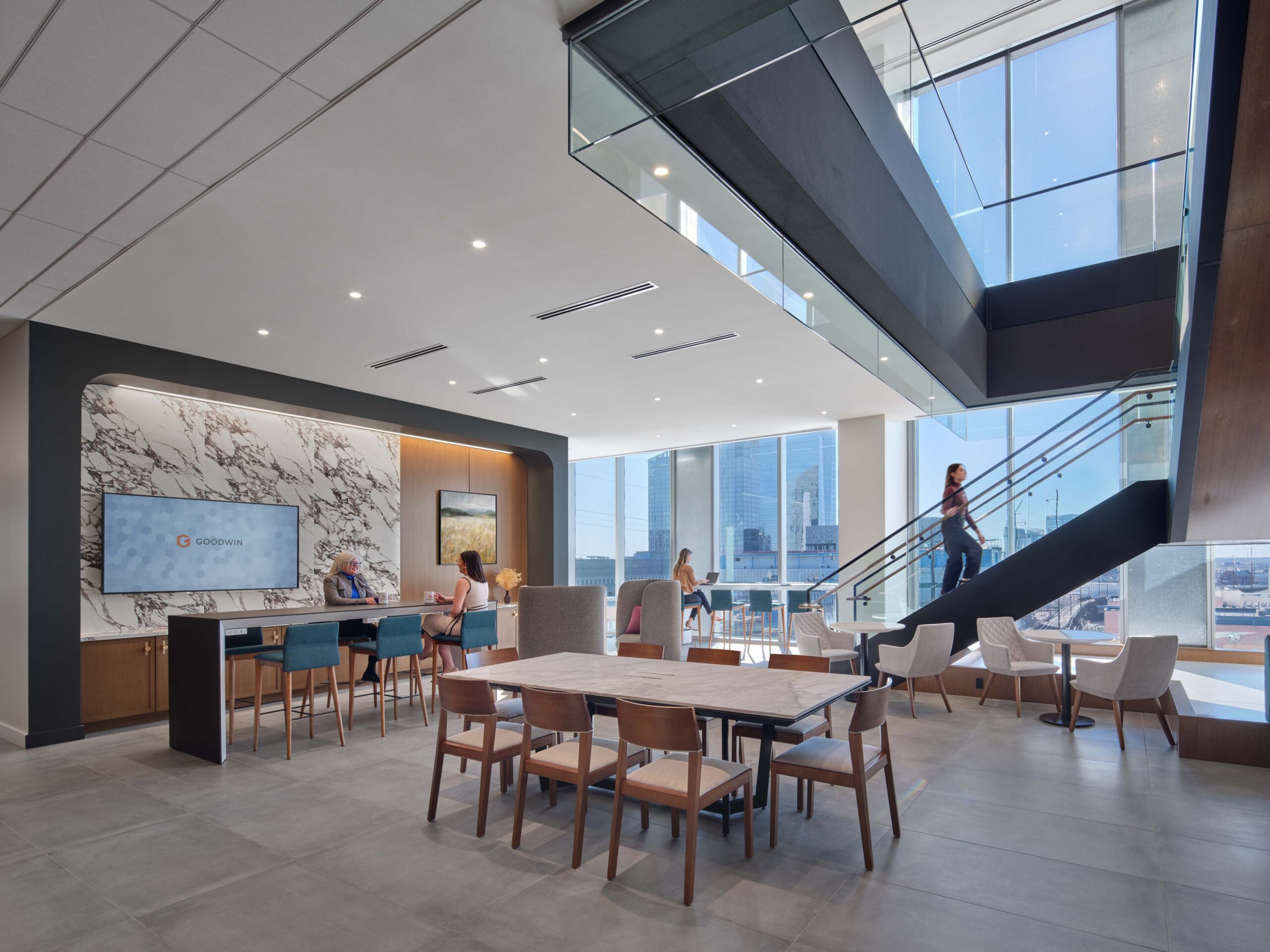 The highly functional and expanded conference center now includes a dedicated catering kitchen and a visitor office for clients needing private workspace. The reimagined café was strategically located to encourage interaction and connection. Reservable workstations provide greater flexibility, seamlessly blending hospitality and workplace design to elevate both employee and client experiences. We redefined what a law firm can be—for Goodwin, it prioritizes equality, hospitality, and connection.