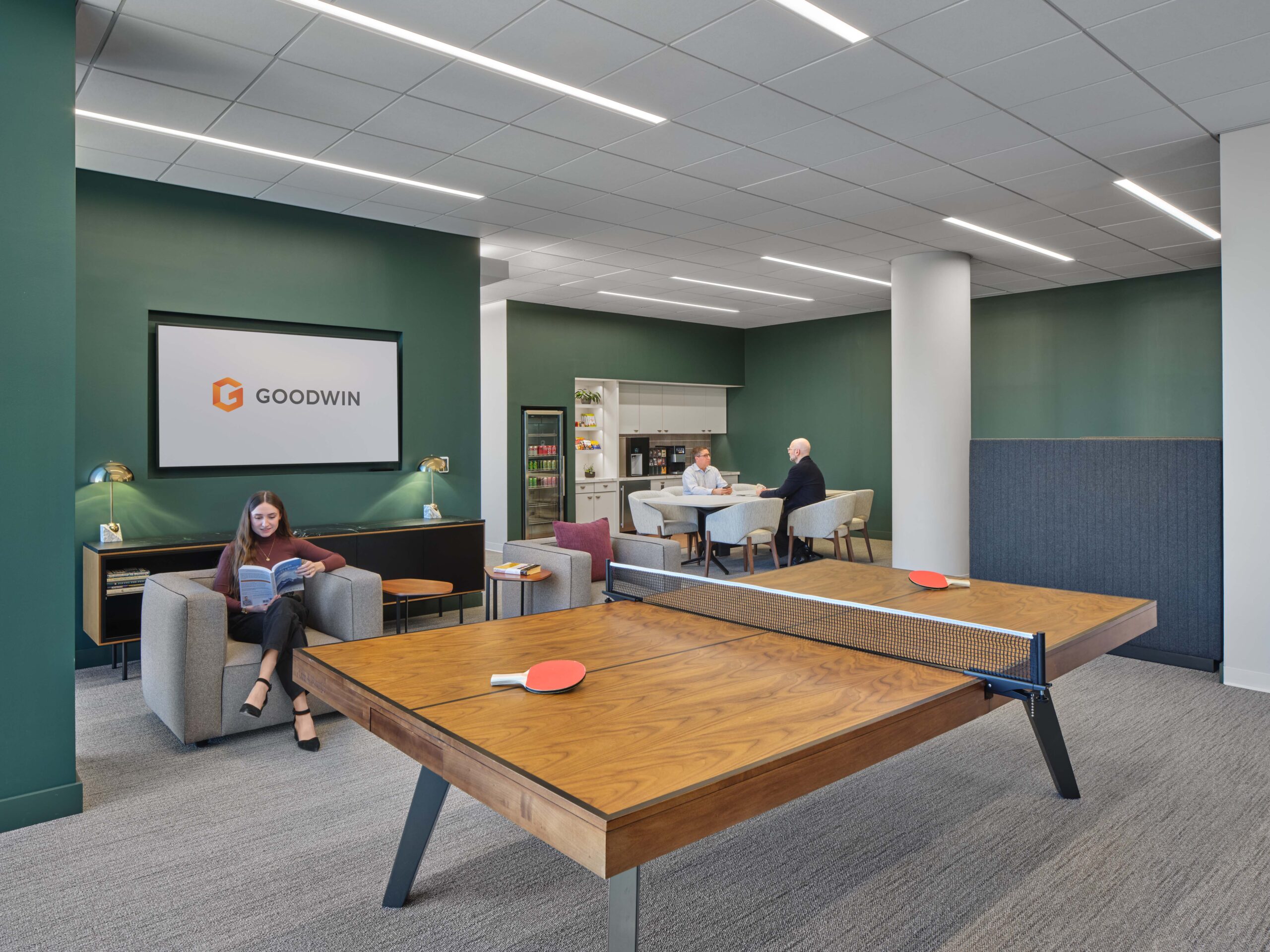 Another defining feature of this “law firm of the future” was a fun-inspiring amenity — a communal space featuring a ping-pong table, a specialty coffee maker, booths for private conversations, and a TV for streaming major events. This fusion of traditional and modern workplace elements fosters a sense of community.