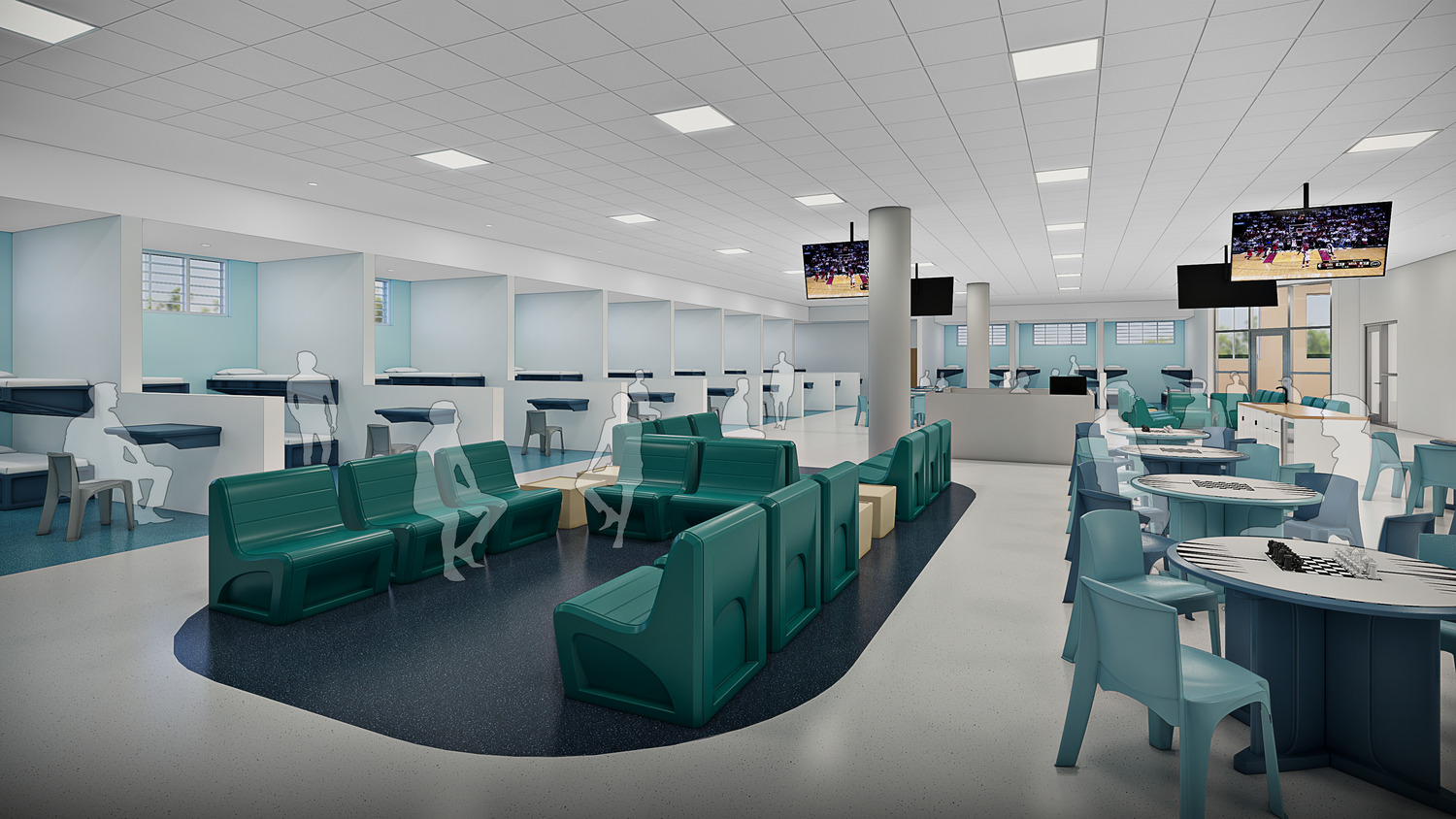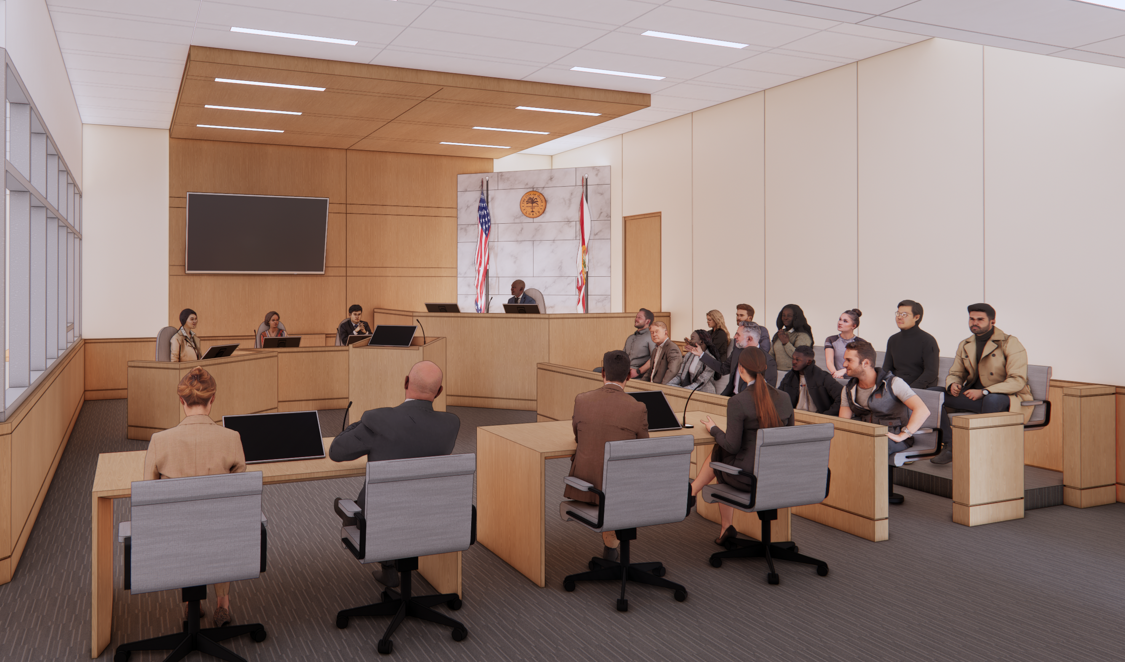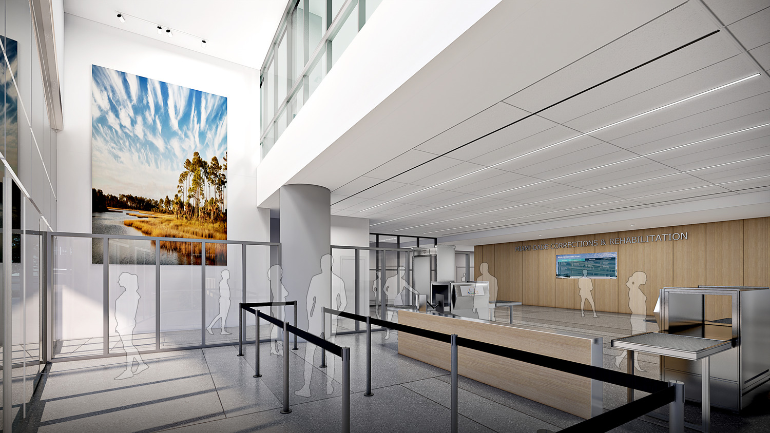 Designed to optimize efficiency in intake, release, and transfer processes, the BRC features a large vehicle sallyport to accommodate high volumes of cars, vans, and buses. The facility includes open waiting areas, single and group cells, and temporary housing for 195 arrestees, supported by medical, records, classification, and administrative spaces. Additionally, the complex will incorporate four courtrooms for initial appearances, providing dedicated spaces for the Clerk, State Attorney, and Public Defender.