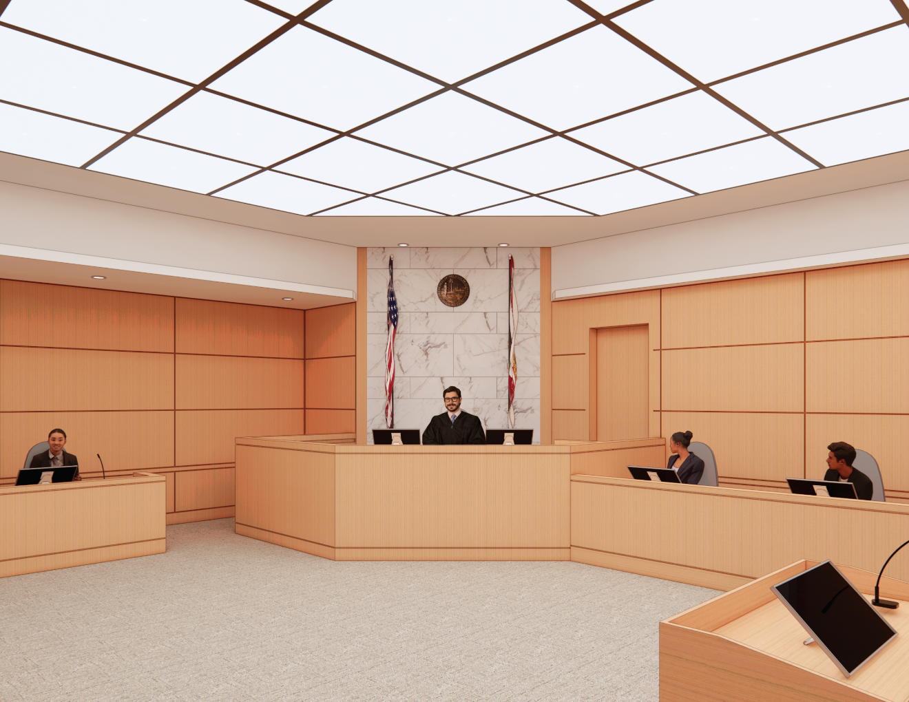 The newly designed court floor features six state-of-the-art courtrooms—four criminal and two civil—along with six judicial chambers, jury deliberation rooms, prisoner holding areas, and essential support spaces. Prioritizing accessibility and efficiency, the design integrates universal ADA accommodations and advanced courtroom technology. Abundant natural light enhances the intuitive wayfinding experience, while custom oak millwork, fabric-covered acoustical panels, and luminous ceiling details create a bright, welcoming environment for staff, judges, and the public.