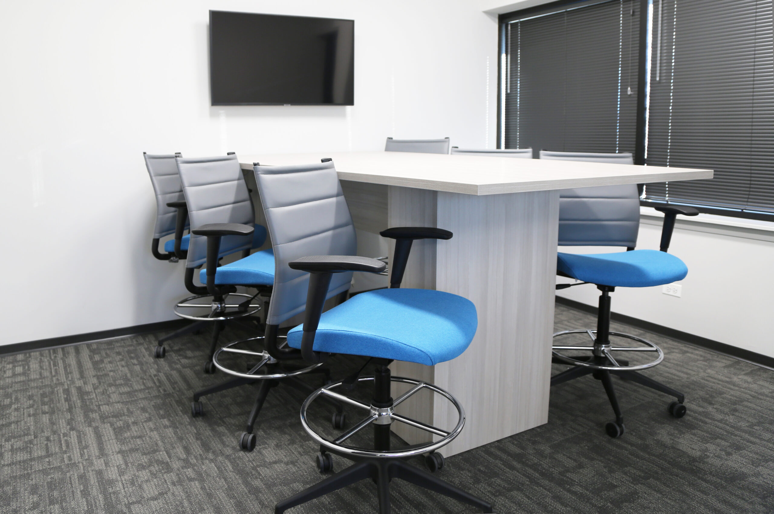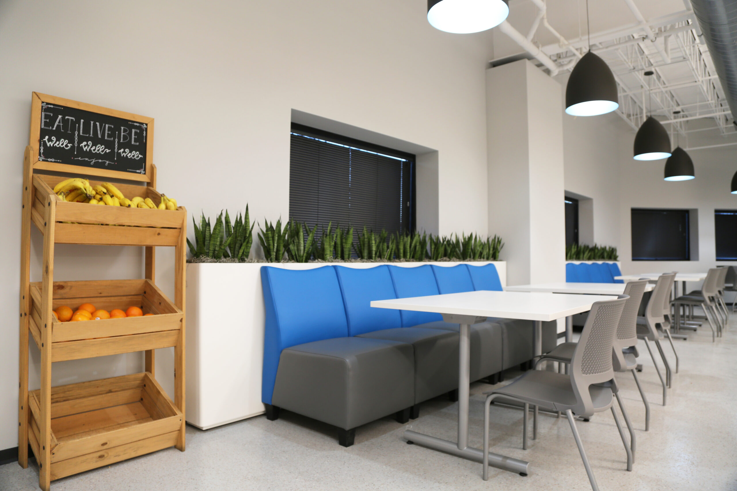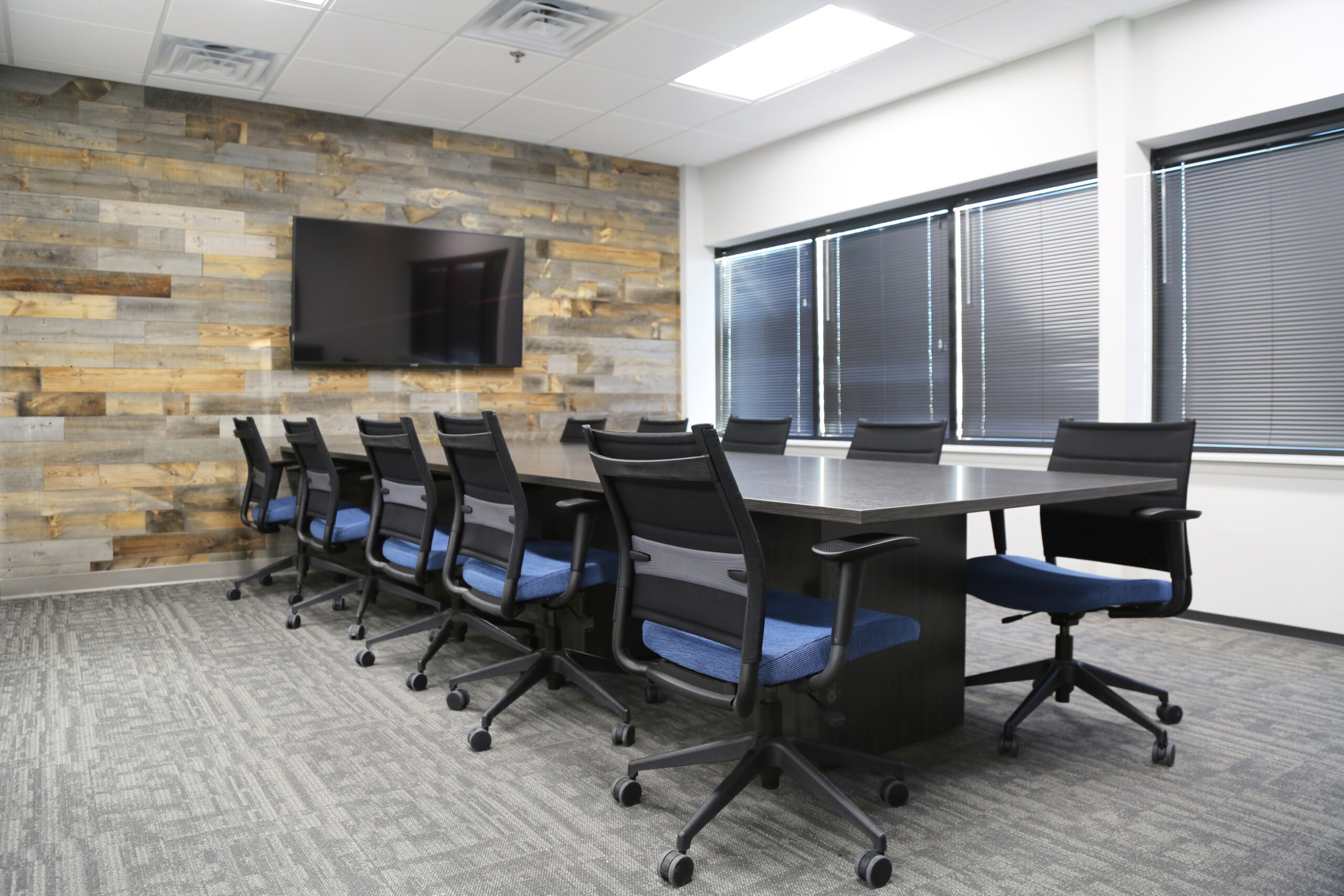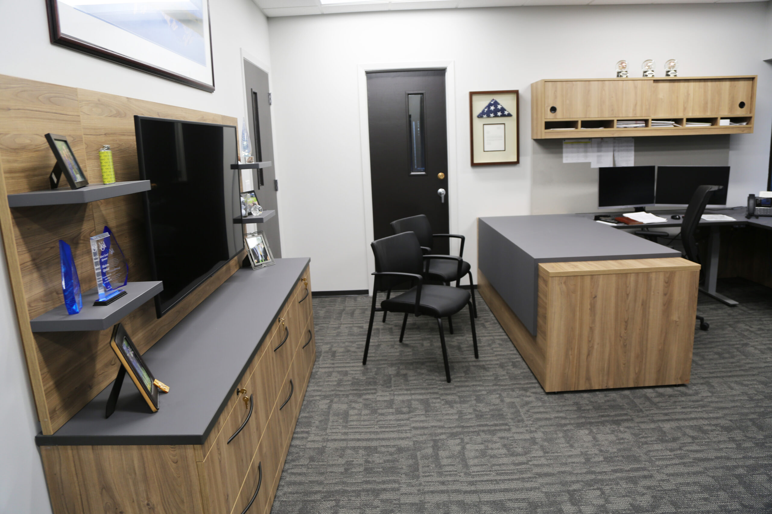 The office space includes newly designed executive offices with custom millwork, an open floor plan for cubicles, a second-floor kitchenette, bathroom upgrades, conference room enhancements, and modernized office spaces, providing a dynamic and functional work environment for their team.