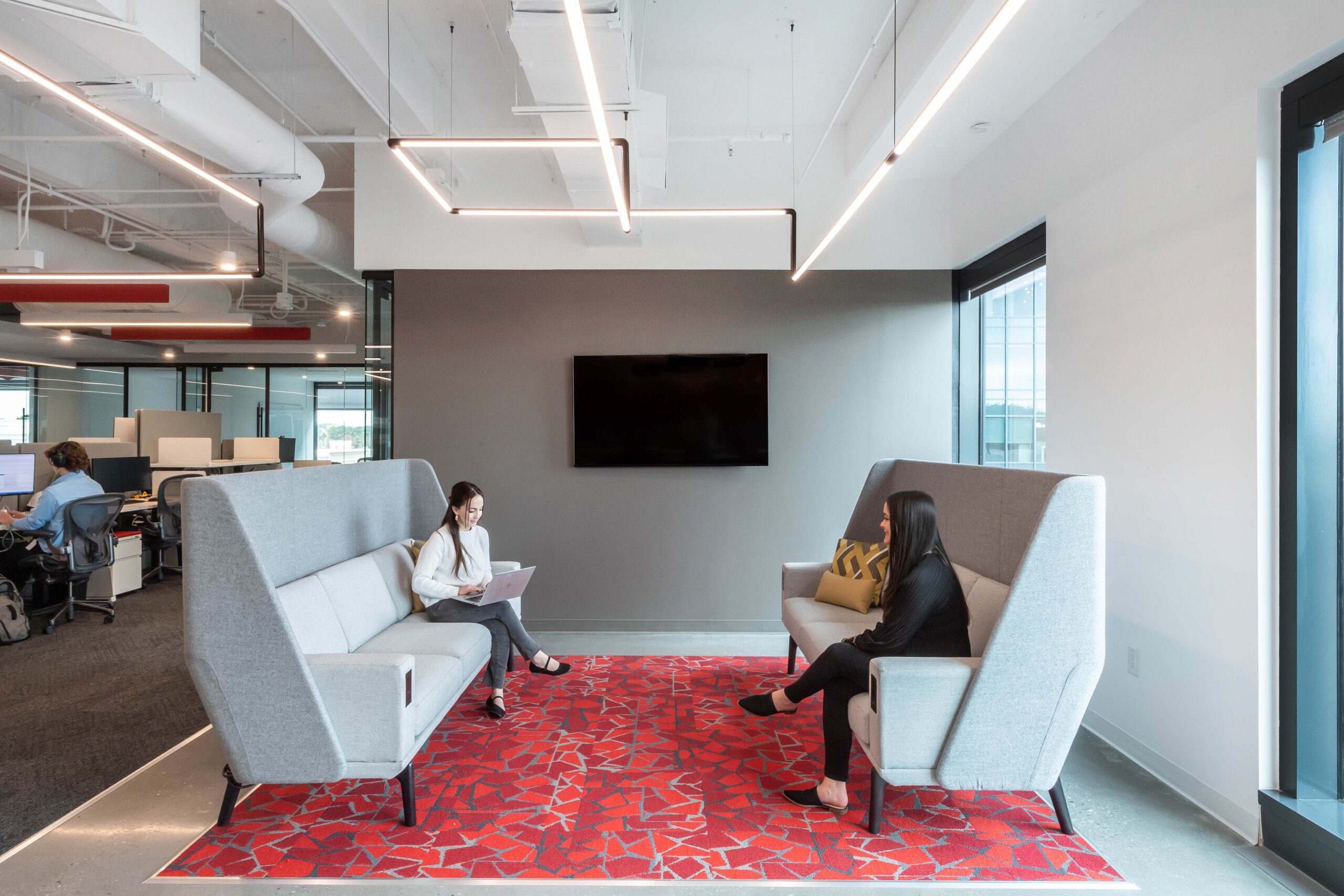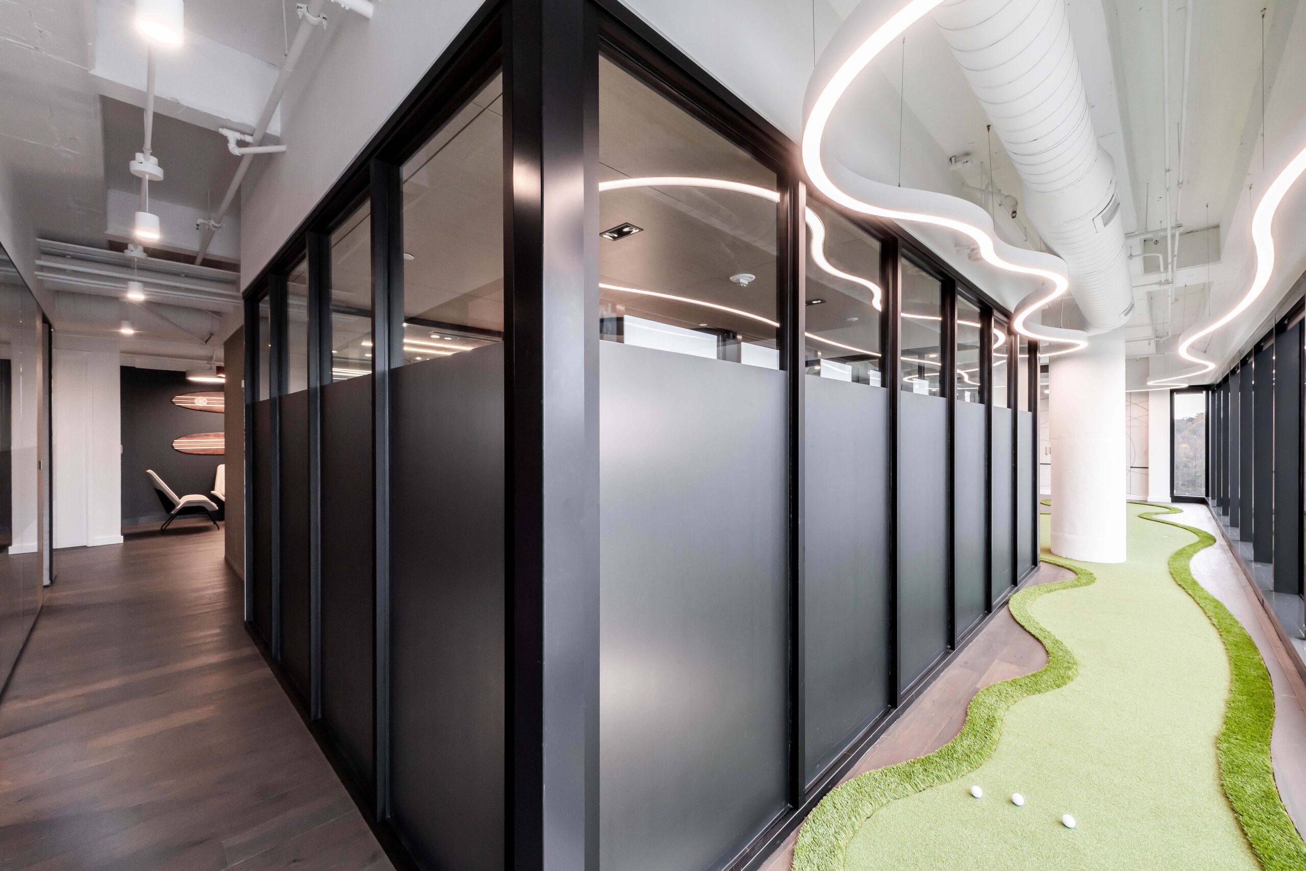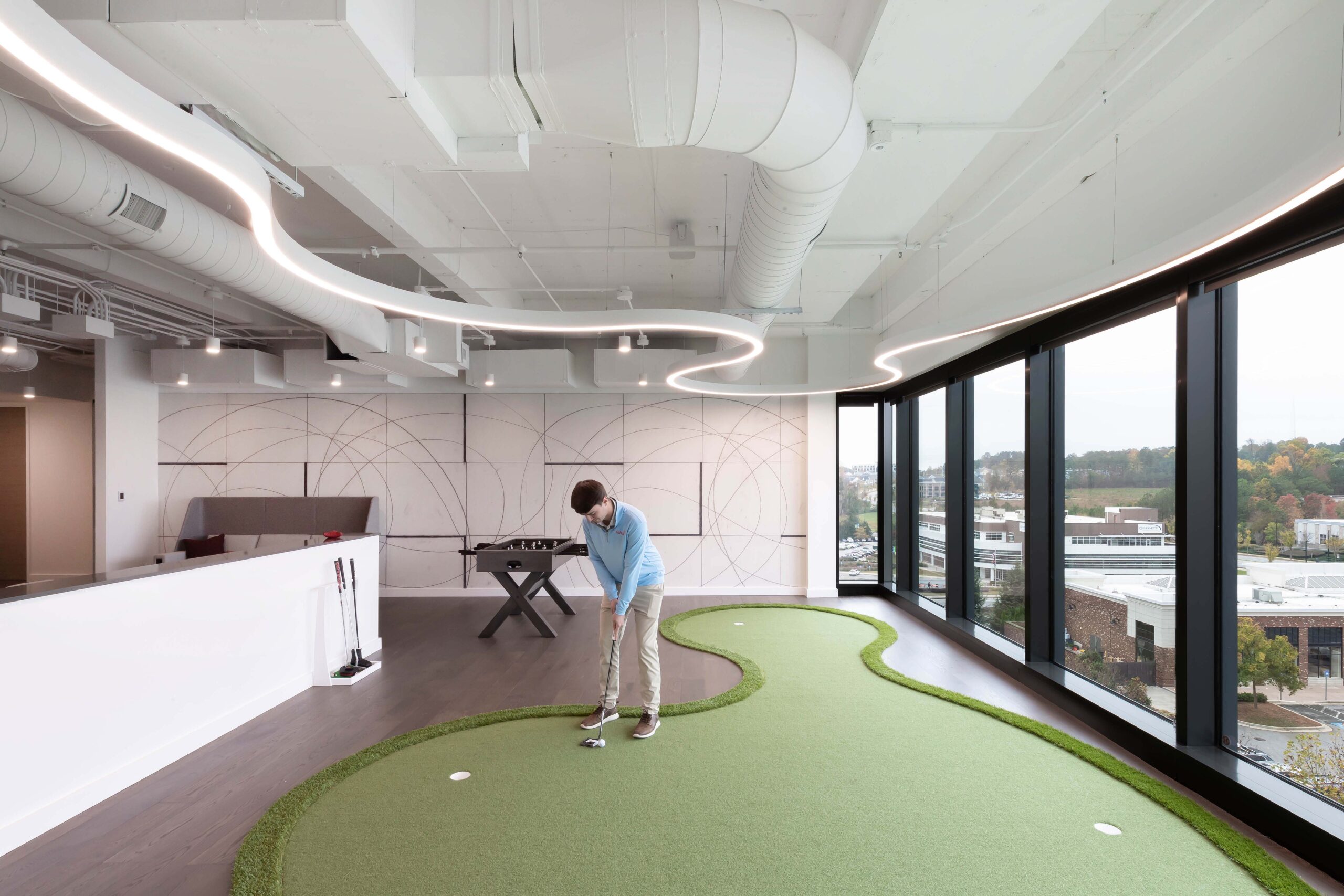 The expansion features a variety of work areas, including collaboration spaces, large training rooms, and private zones, all promoting workplace flexibility. Highlights include the Innovation Room, equipped with advanced technology and inspiring lighting fixtures, and the Social Hub, a dynamic collaboration space featuring a custom putting green and foosball table.