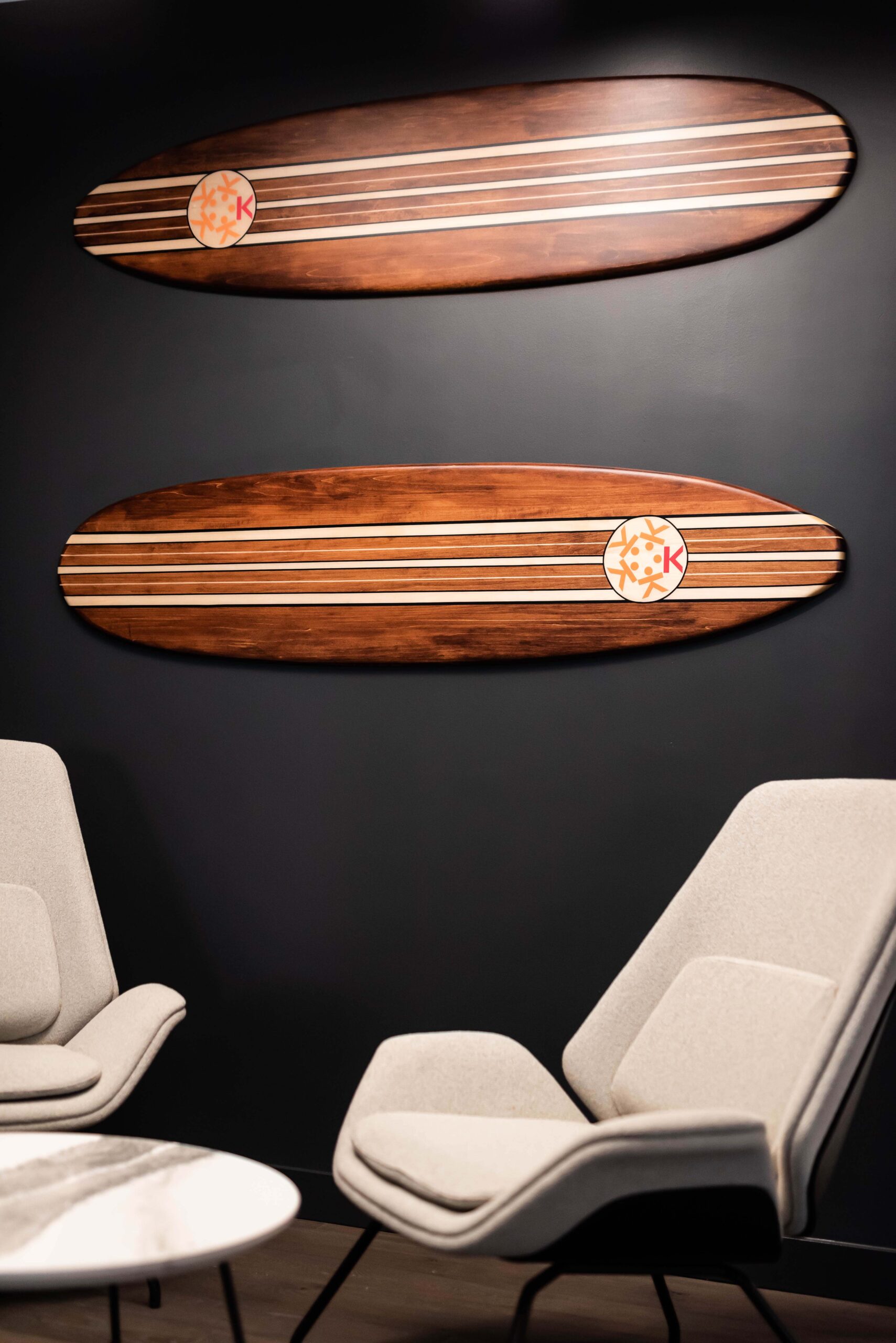Inspired by the Hawaiian meaning of their name, “foundation,” the design integrates wave-like elements in custom lighting, surfboards, backsplash tiles, and acoustic baffles, symbolizing movement and energy. Branded industrial tables with “K”-shaped legs and logos further amplify their unique identity.
