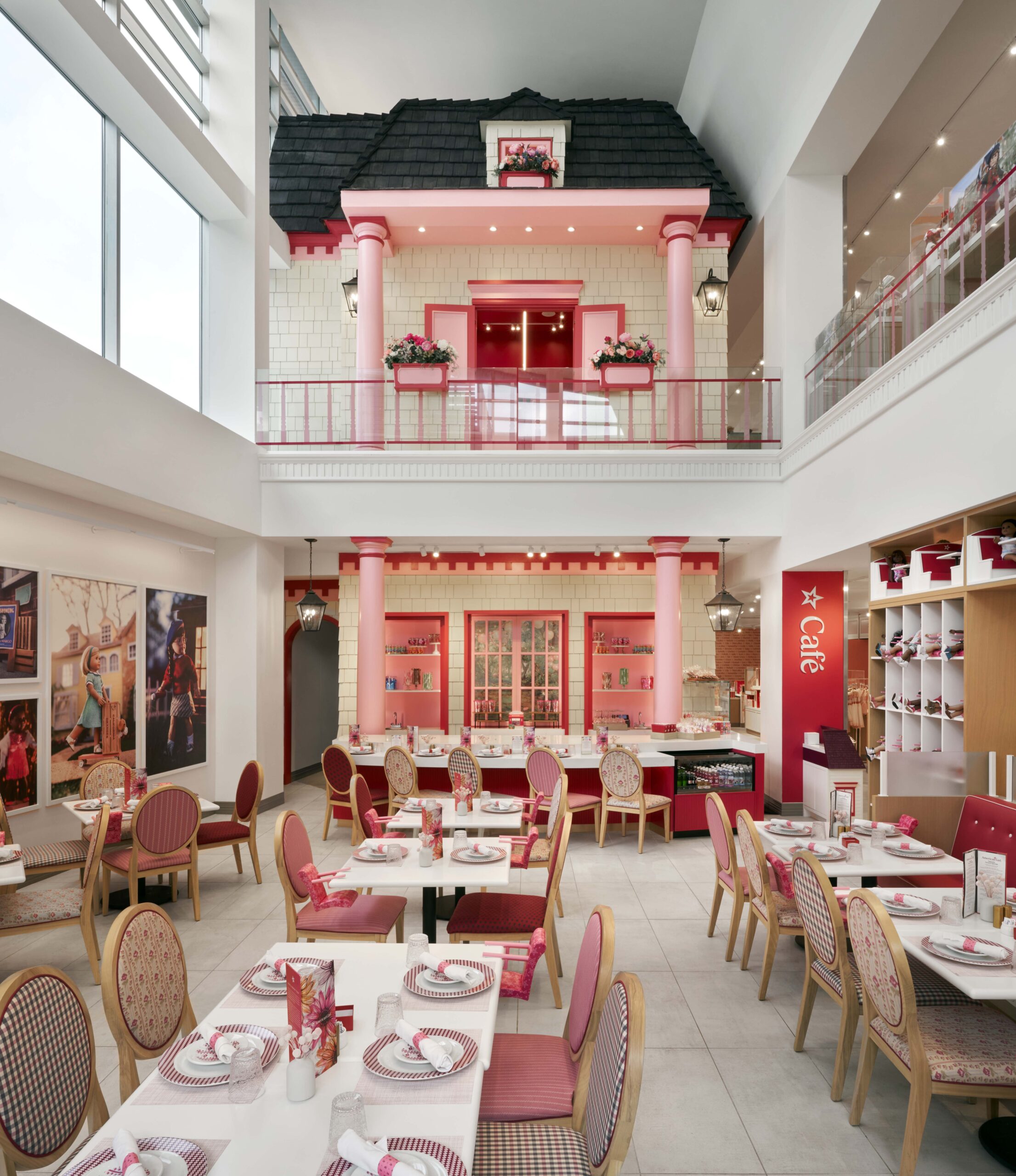 The first-floor American Girl Café serves as a vibrant centerpiece, offering an enchanting dining experience surrounded by a dollhouse-inspired setting. Guests arriving from the parking garage are welcomed directly to the second-floor retail space, where historical characters, contemporary Girl of the Year™, and Truly Me™ lines are displayed to highlight their unique narratives. The second floor also houses the American Girl Salon, where whimsical and spa-like elements create memorable experiences for girls and their dolls.
